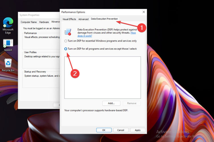 - 单击数据执行保护选项卡,然后选择为除我选择的程序和服务之外的所有程序和服务打开 DEP。