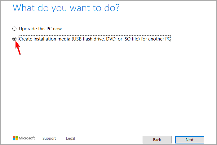 - Select Create installation media (USB flash drive, DVD, or ISO file) for another PC and click on Next.