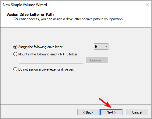 - 选择要用于此驱动器的驱动器号,然后按下一步继续。