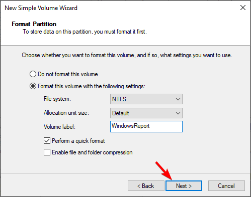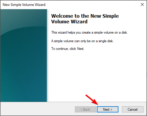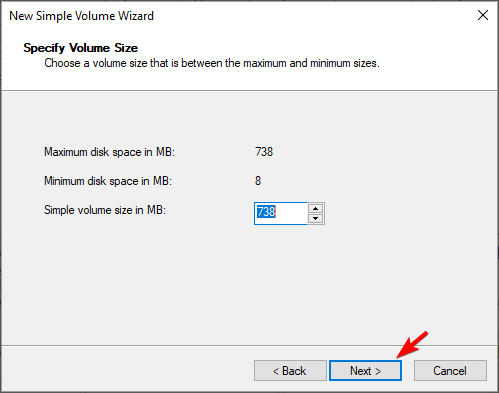 - 将简单卷大小(以 MB为单位)设置为等于以MB为单位的最大磁盘空间,然后单击下一步。