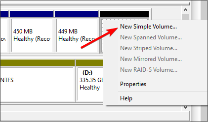 - 现在您应该在磁盘管理器中看到未分配的空间。右键单击Unallocated space 并选择New Simple Volume。