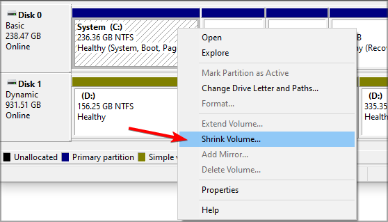 - 找到该驱动器后,右键单击它并选择Shrink Volume。