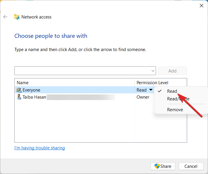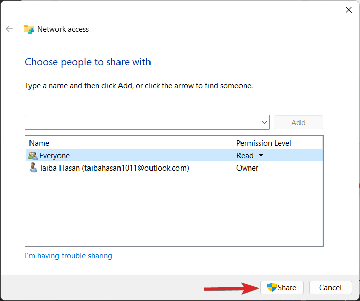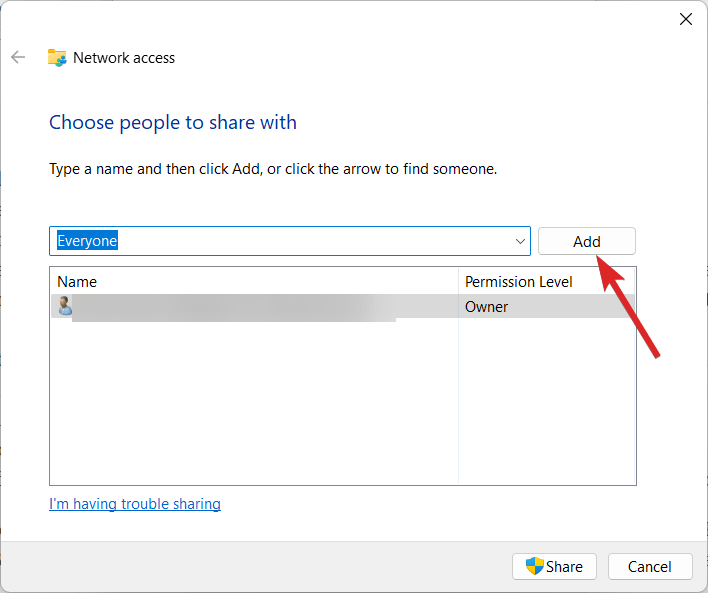 - 选择要向其授予文件夹访问权限的用户。您也可以选择“所有人”。完成后,按右侧的添加按钮。