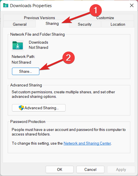 - 切换到属性窗口的“共享”选项卡,然后单击“网络文件和文件夹共享”部分下的“共享”按钮。