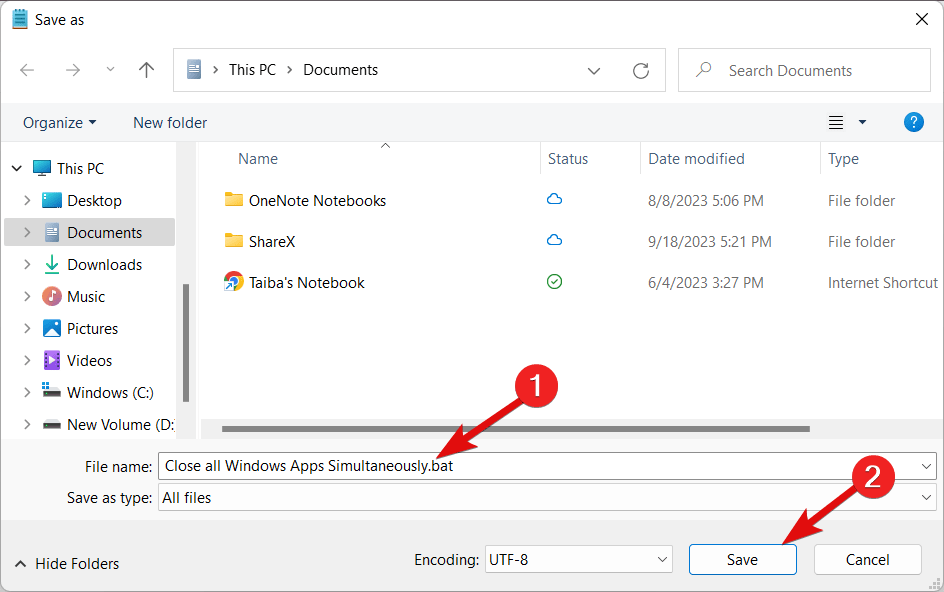 - 在出现的对话框中,键入“同时关闭所有 Windows 应用.bat作为文件名,然后单击”保存“按钮。