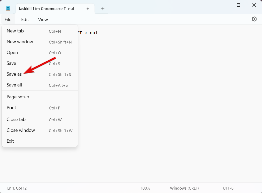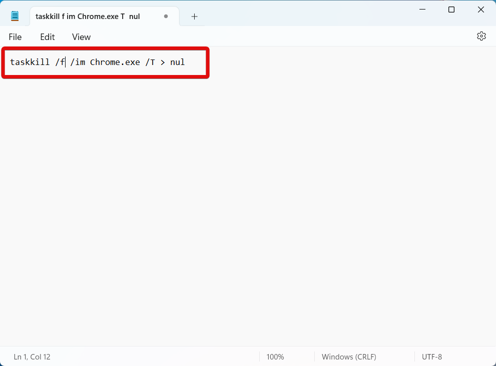 - 现在,双击新形成的文本文件将其打开,然后插入以下命令:taskkill /f /im Chrome.exe /T > nul