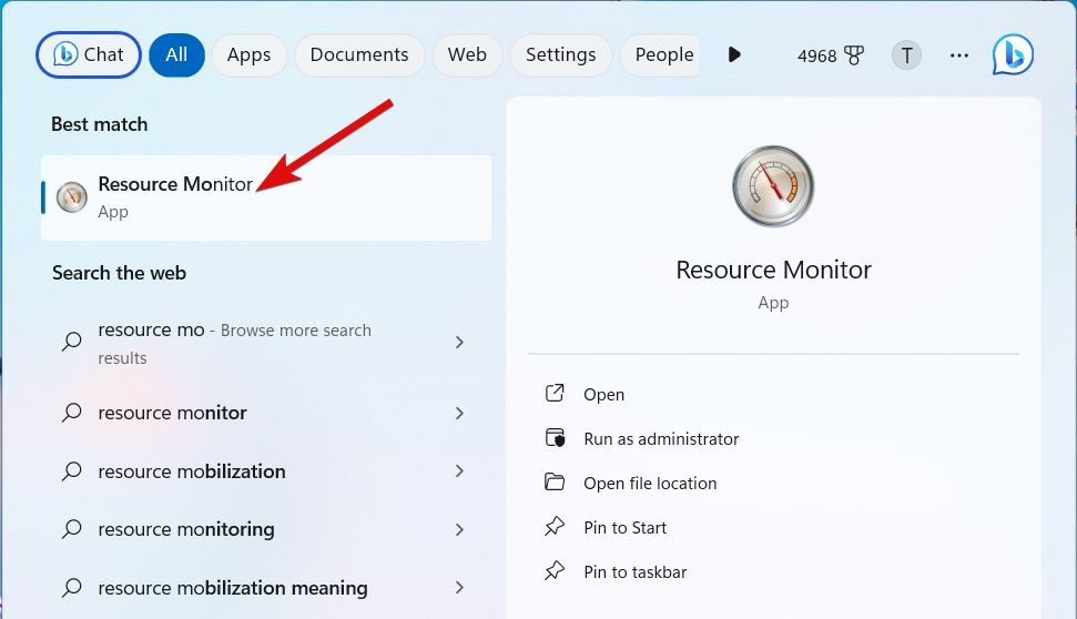- 首先按 Windows 键,然后在搜索栏中键入资源监视器,然后单击相关搜索结果以启动它。