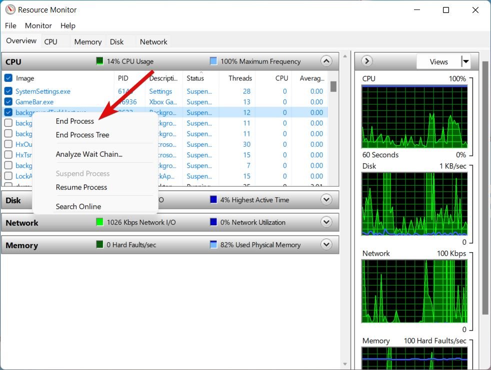 选择资源监视器而不是任务栏和任务管理器来关闭 Windows 11 中的所有活动应用程序的一个优点是其内置的自动恢复功能。如果您不小心关闭了重要的系统进程,此功能将变得非常有用。如果您不小心关闭了程序,您可以选择 恢复进程 重新启动应用程序的选项。