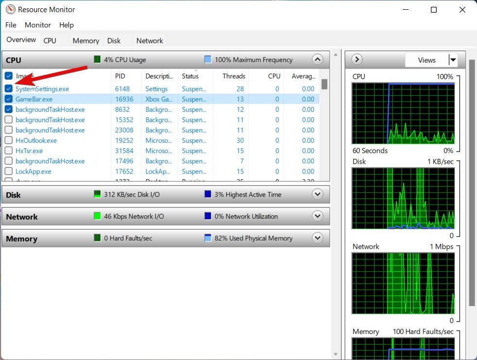 - 导航到“概述”选项卡,并选中要在此处终止的当前活动程序的复选框。