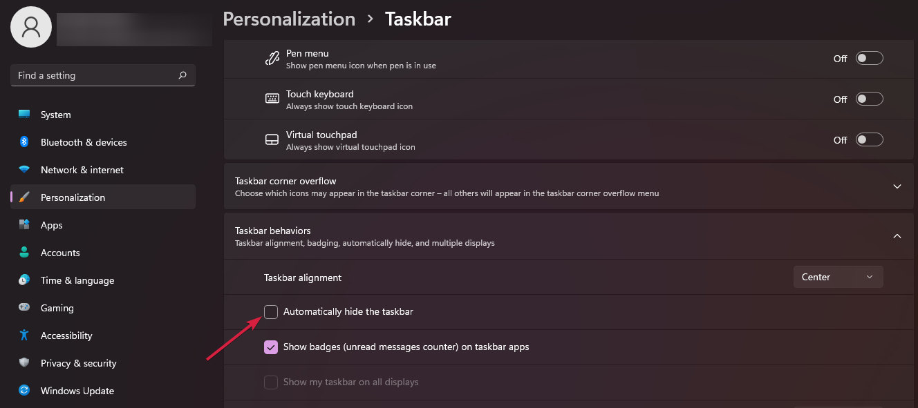 - 最后,在任务栏行为下,选中自动隐藏任务栏选项旁边的框。
