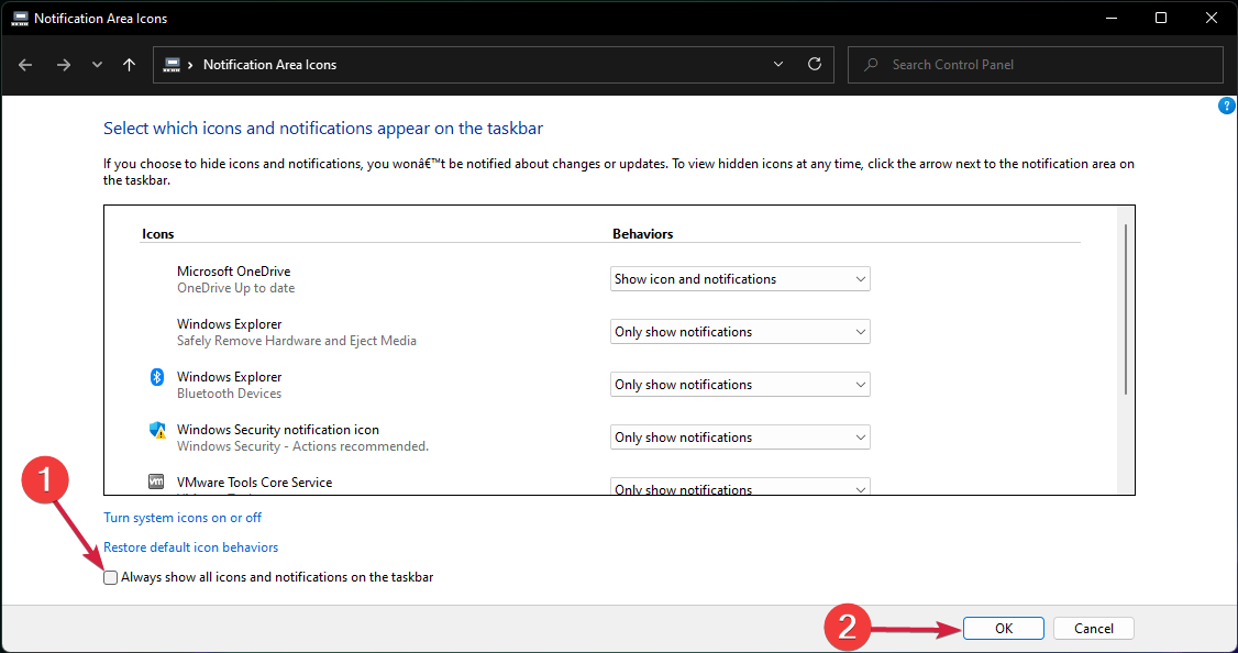 您可以从同一“通知区域图标”窗口本身手动选择应在任务栏上显示的图标和通知。