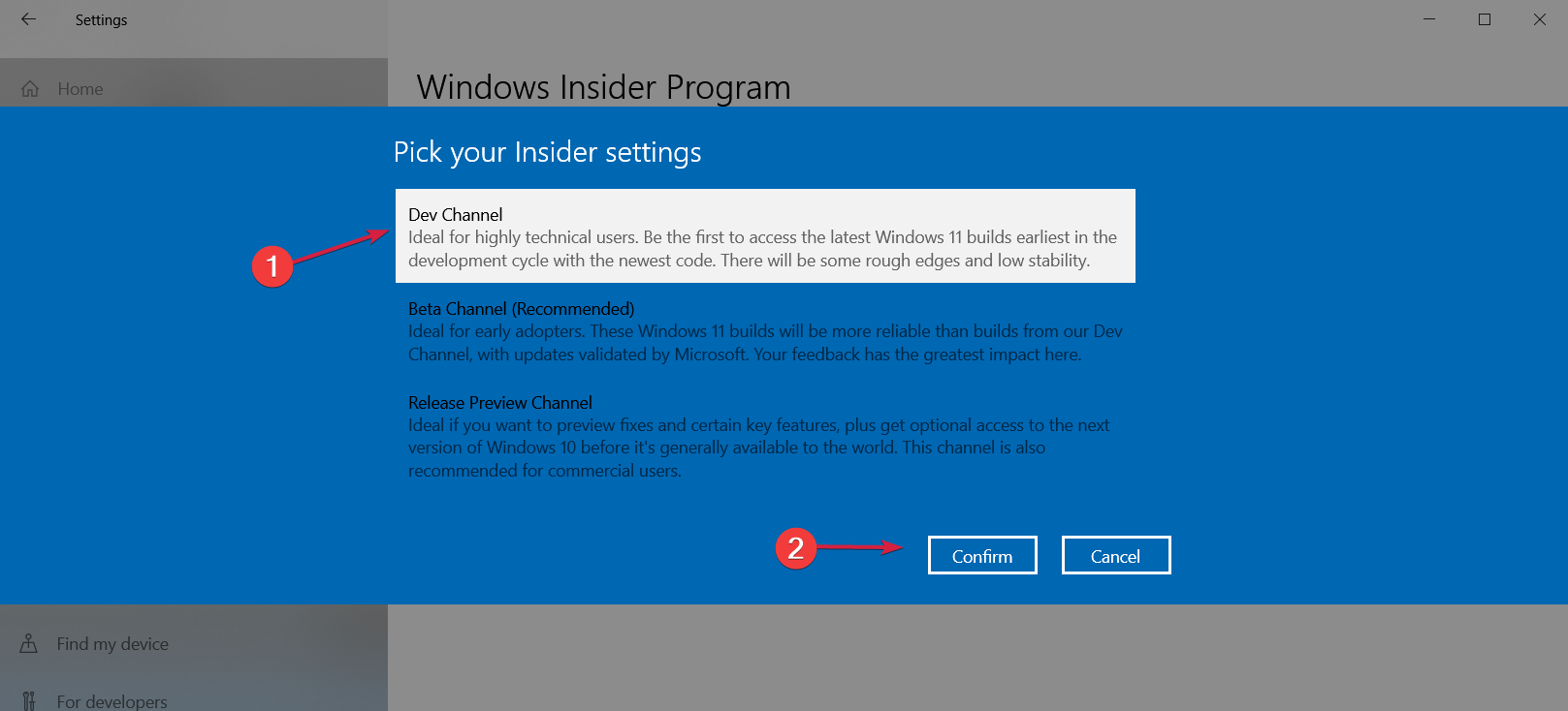 - 接下来,您需要加入 Dev Channel 或 Beta Channel,因为只有来自这些渠道的内部人员才能升级到 Windows 11 Preview Build,因此请选择Dev Channel或Beta Channel,然后单击Confirm。