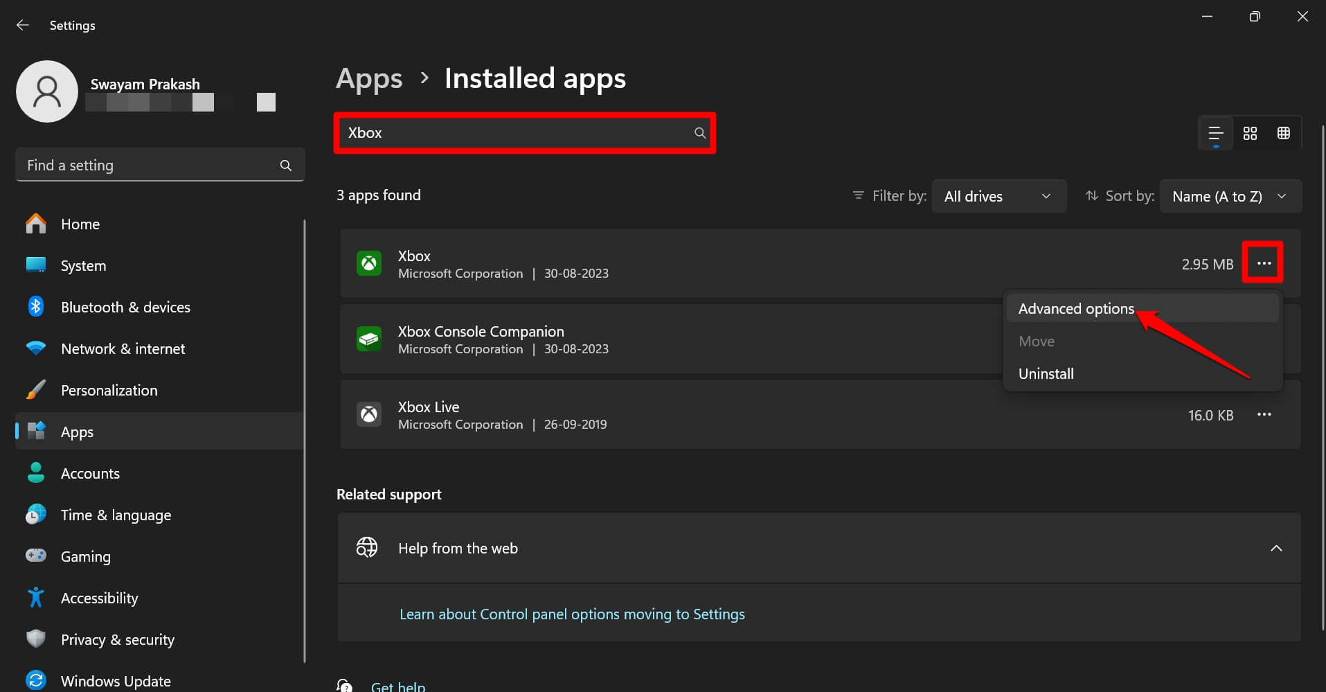 - 单击 Xbox 旁边的 3 点图标,然后选择“高级选项”。
