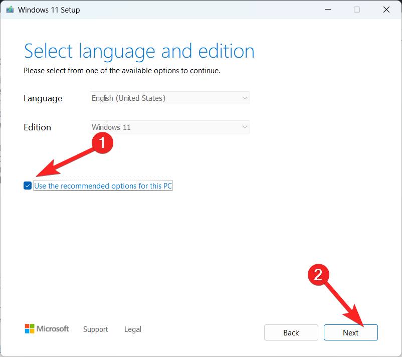 - 接下来,启用“使用此电脑的推荐选项”复选框,然后单击“下一步”按钮继续。