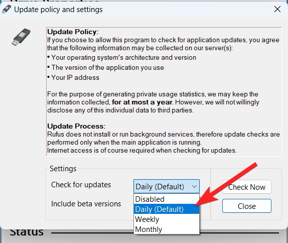 - 在“设置”部分中,使用“检查更新”下拉菜单,然后选择“每日(默认)”选项。