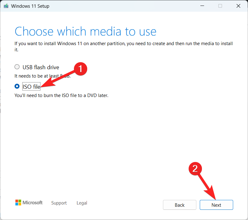 - 接下来,启用 ISO 文件格式旁边的单选按钮,然后再次单击“下一步”按钮。