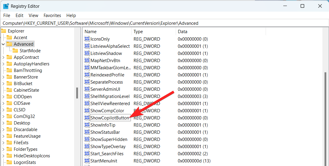 - 找到 ShowCopilotButton DWORD 并将其值设置为 1 以激活该功能。