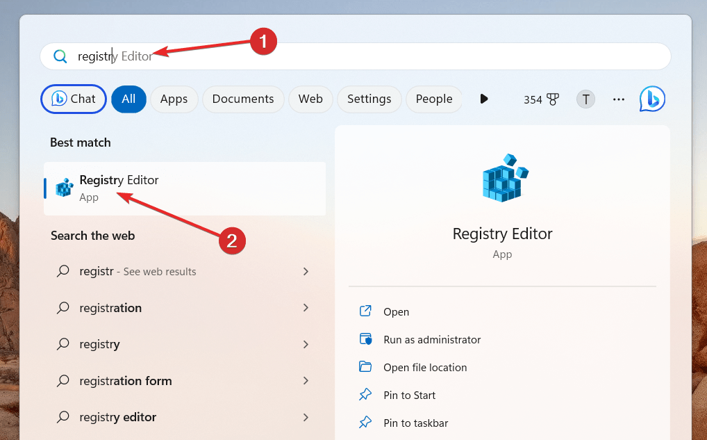 - 按 Windows 键启动“开始”菜单,在搜索栏中键入 regedit,然后从搜索结果中选择“注册表编辑器”。