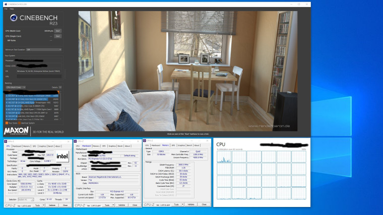 这还不是全部,据称为 Core i9-12900K 运行的 Cinebench R23 的图像,尽管这一次,它显示了 CPU 在多核测试中的性能。除了 Cinebench R23 应用程序外,该图像还打开了 CPU-Z 和任务管理器,使图像更具可信度。
