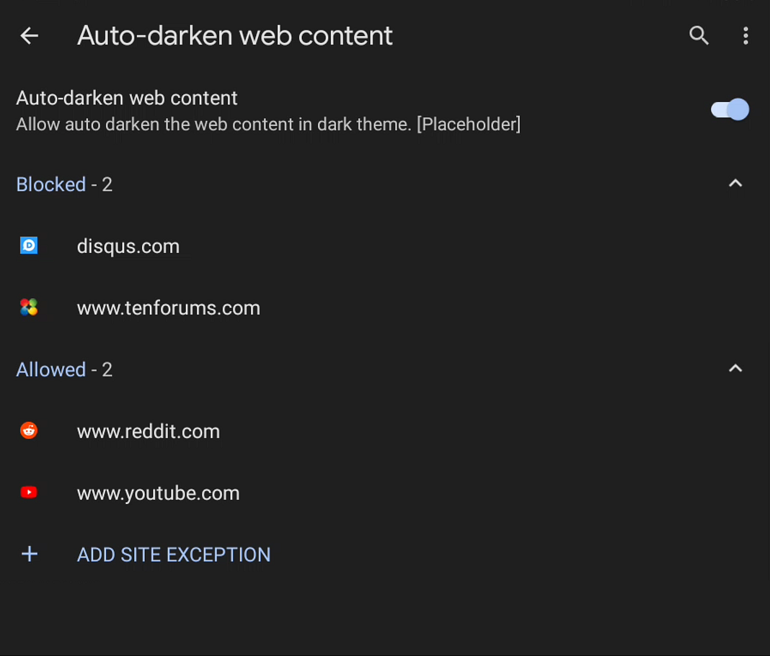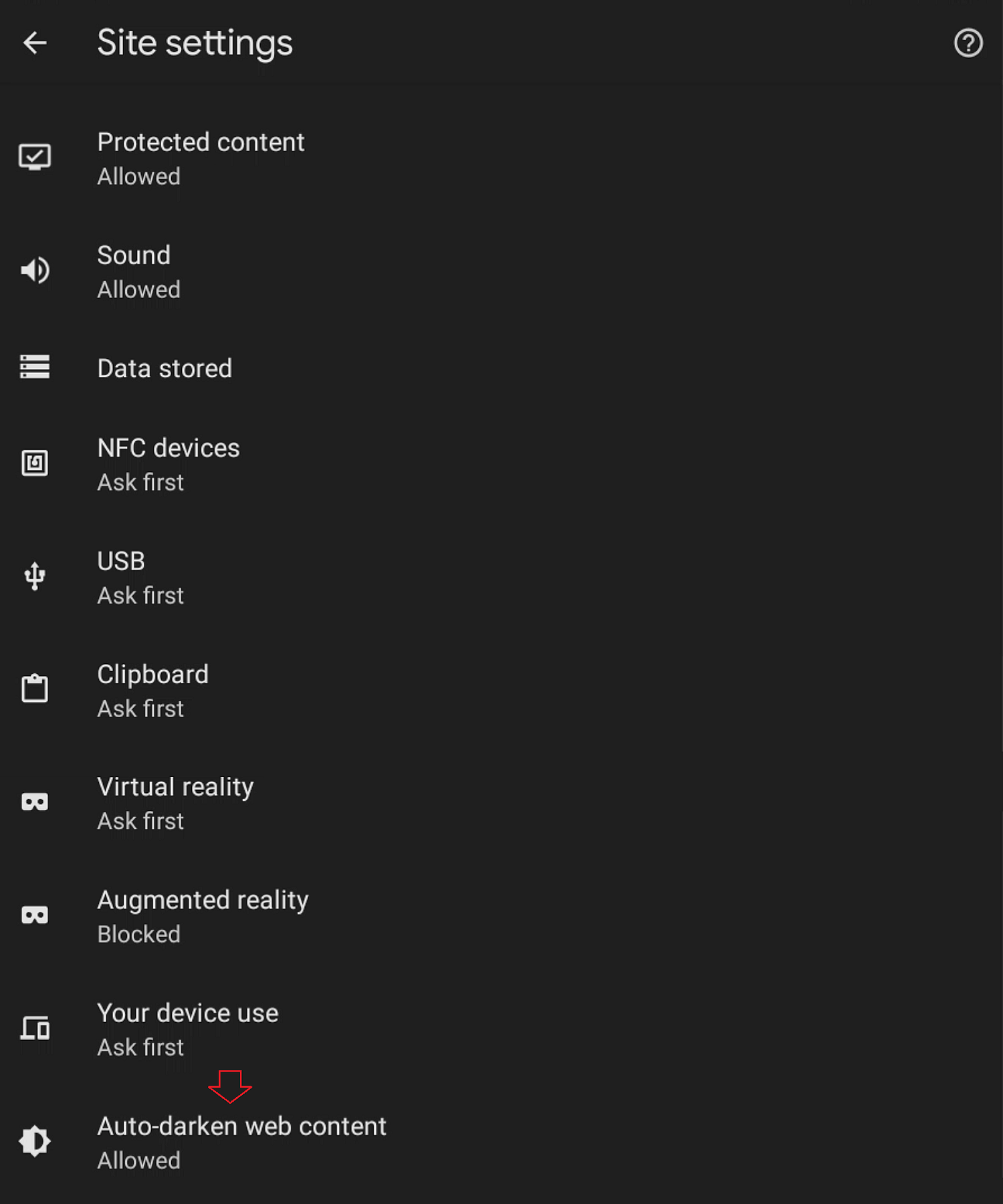 在 Android 版 Chrome Canary 中,站点设置中有一个新部分用于启用或禁用“自动变暗网络内容”: