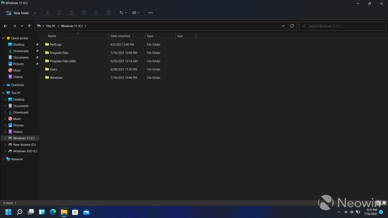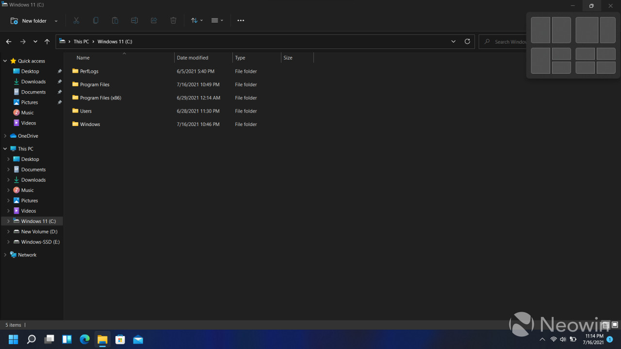 文件资源管理器也获得了一些 Windows 11 的优点,因为这家雷德蒙德巨头将其与新的视觉更新保持一致。新设计摒弃了顶部功能区,转而采用快速操作按钮。这是微软的又一次尝试帮助那些使用基于触摸的设备的人,因为与公司以前在顶部功能区上的小项目相比,它可以轻松地与大按钮进行交互。但是,该公司在顶部添加了一个新的下拉选项以容纳所有功能区选项。