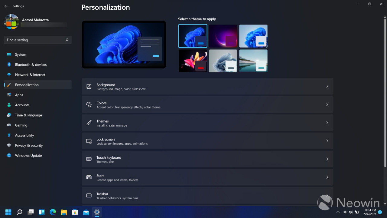 转向个性化,微软 为 Windows 11 添加了几个新的个性化选项。其中包括改进的暗模式、新的系统主题、屏幕触摸键盘的主题等等。