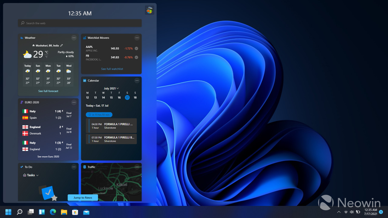 Windows 11 将看到小部件的回归,尽管与我们习惯在 Windows 7 中看到的不同。微软在任务栏上添加了一个新的小部件按钮,它会在侧面打开一个弹出窗口,让用户可以轻松访问天气、交通、股市更新、体育、新闻标题等。微软将根据用户偏好整理数据,并将从 MSN 中提取。该功能是Microsoft提供的“新闻和兴趣”选项的扩展今年早些时候添加到 Windows 10。我们之前已经广泛介绍了 Windows 11 小部件,您可以查看我们关于该主题的文章,了解有关小部件及其工作原理的更多信息。