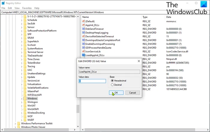 - 在该位置的右侧窗格中,双击LoadApplnit_DLLs 条目以编辑其属性。