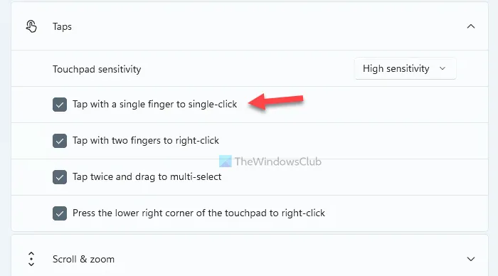 如果您想关闭单击功能,您需要从“用单指点击单击” 复选框中删除勾号 。
