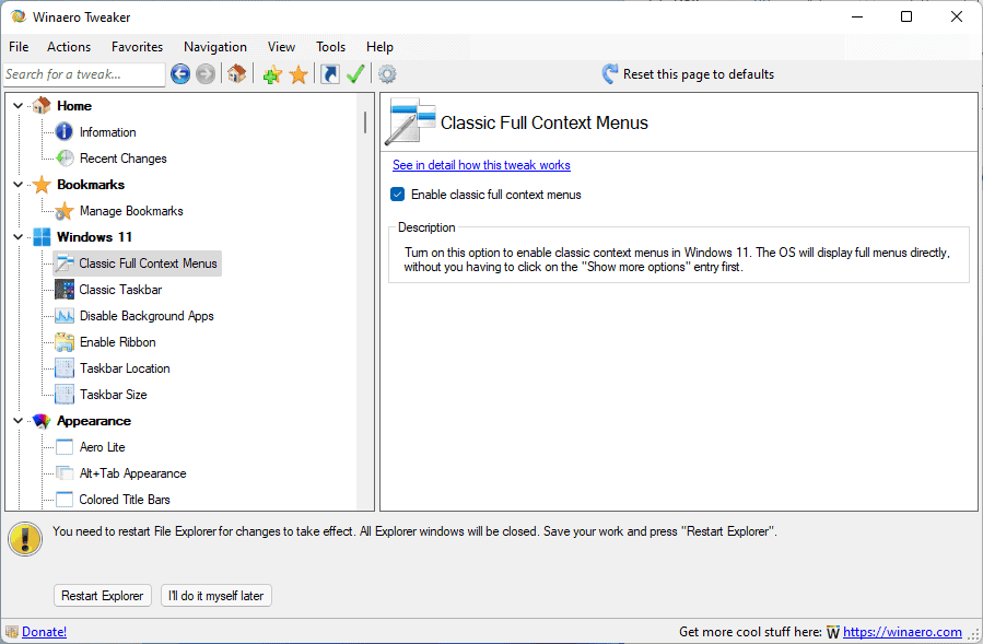 Microsoft 使在 Windows 11 中启用经典资源管理器上下文菜单变得困难。设置或文件资源管理器中没有选项,并且在最新版本的 Windows 11 中,一些注册表编辑不再起作用。仍然有可能不过,免费的 Winaero Tweaker 工具提供了最简单的选项之一。