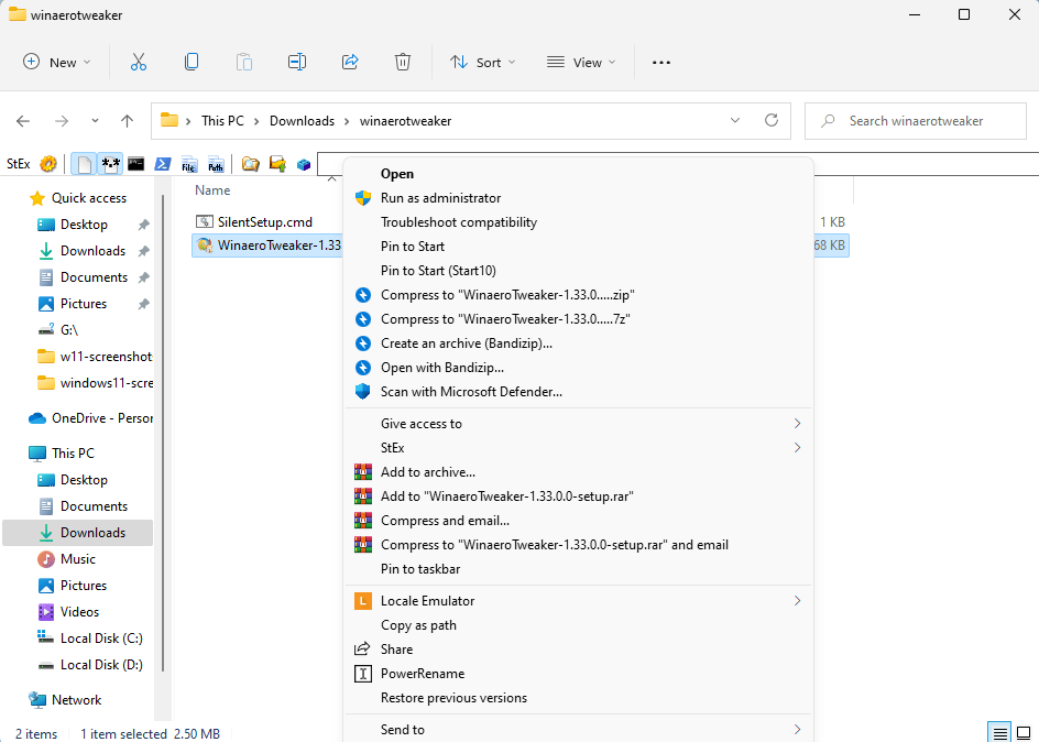 如果您比较上面屏幕截图中显示的两个上下文菜单,您会注意到 Windows 11 的新上下文菜单并未显示经典菜单中显示的大部分选项。如果您经常在文件资源管理器中访问第三方工具的功能,例如像 WinRar 这样的存档程序,那么您可能更喜欢启用经典菜单来加快进程。