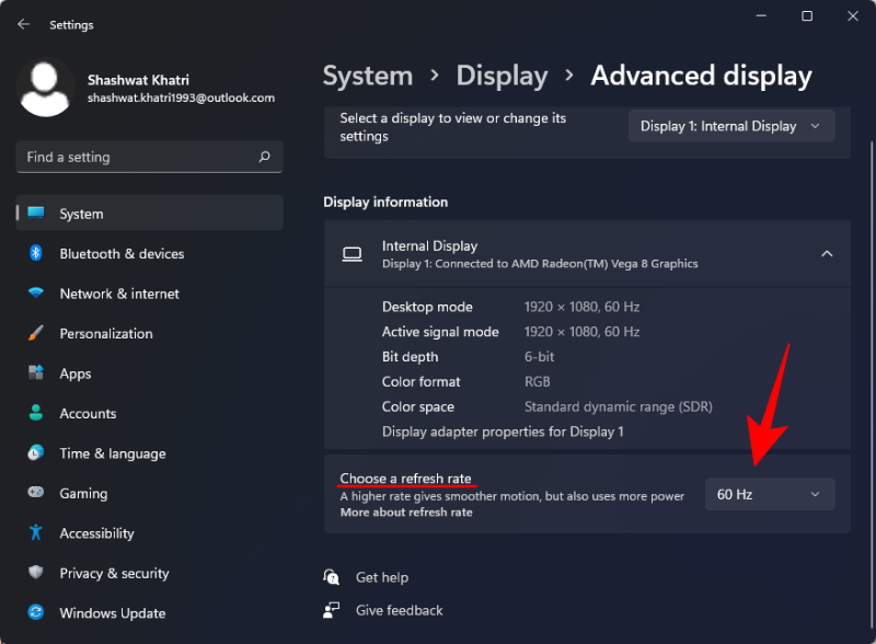 刷新率将在“选择刷新率”旁边提及。您还可以从可用的刷新率选项中进行选择。