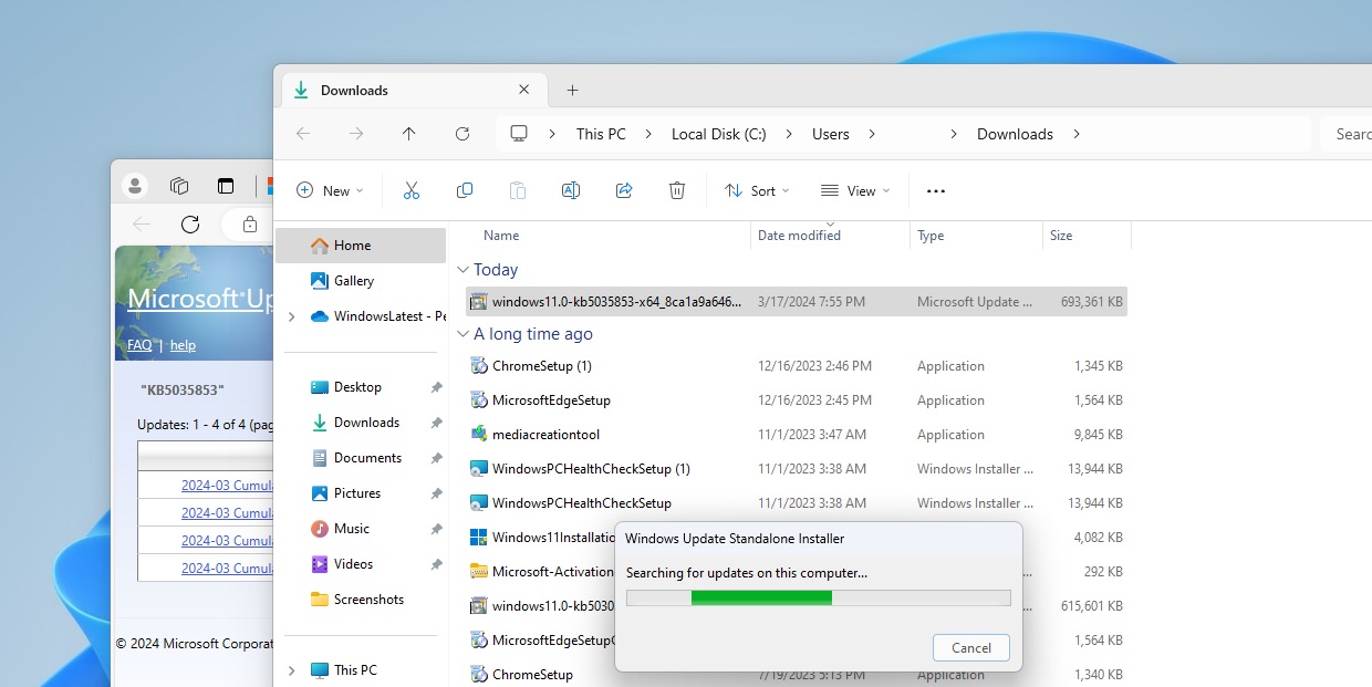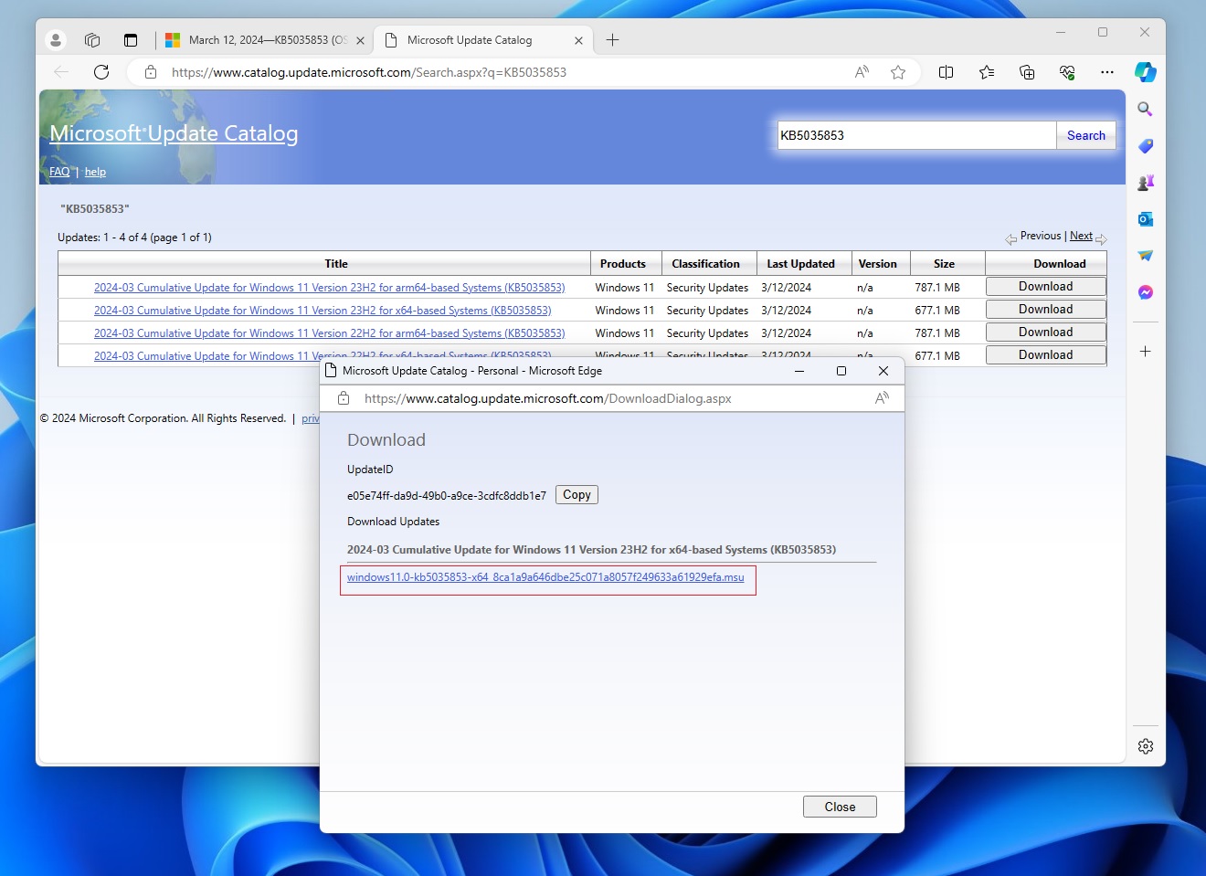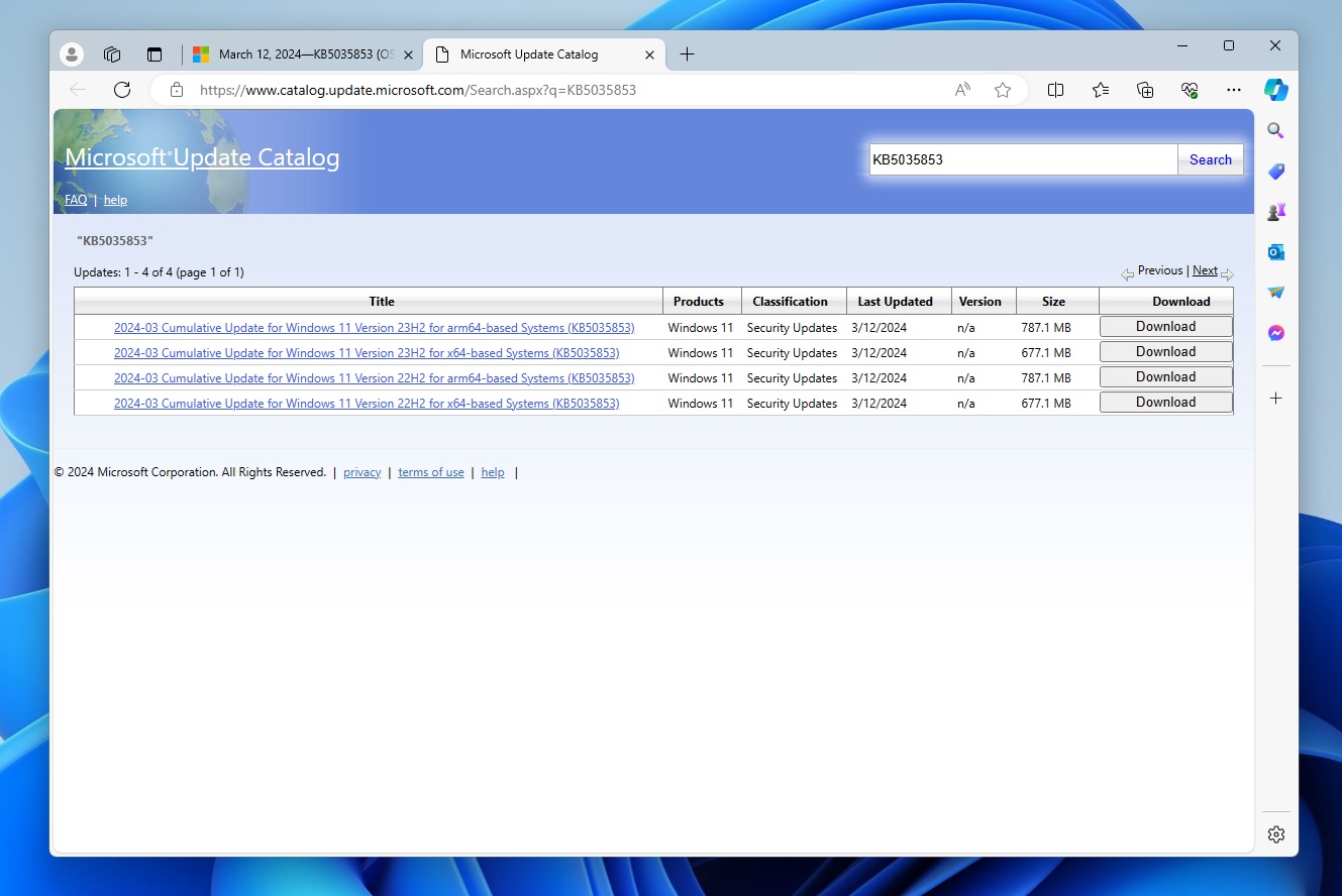 - 单击页面右上角的搜索栏,然后搜索KB5035853。您需要搜索最新的补丁,如果您不确定,可以使用我们的 Windows 11 跟踪器。