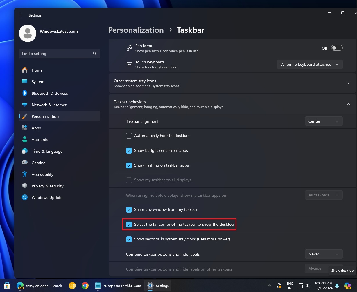 如上面的屏幕截图所示,Copilot 图标现在移动到任务栏的最右侧,取代了显示桌面(幸运的是,您可以将其从“设置”中恢复)。
