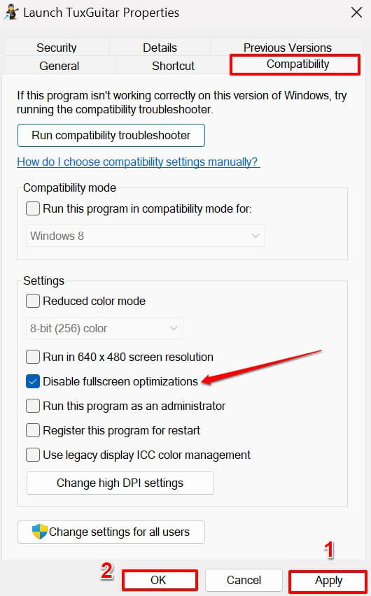 - 在“设置”部分下,滚动到“禁用全屏优化”复选框。