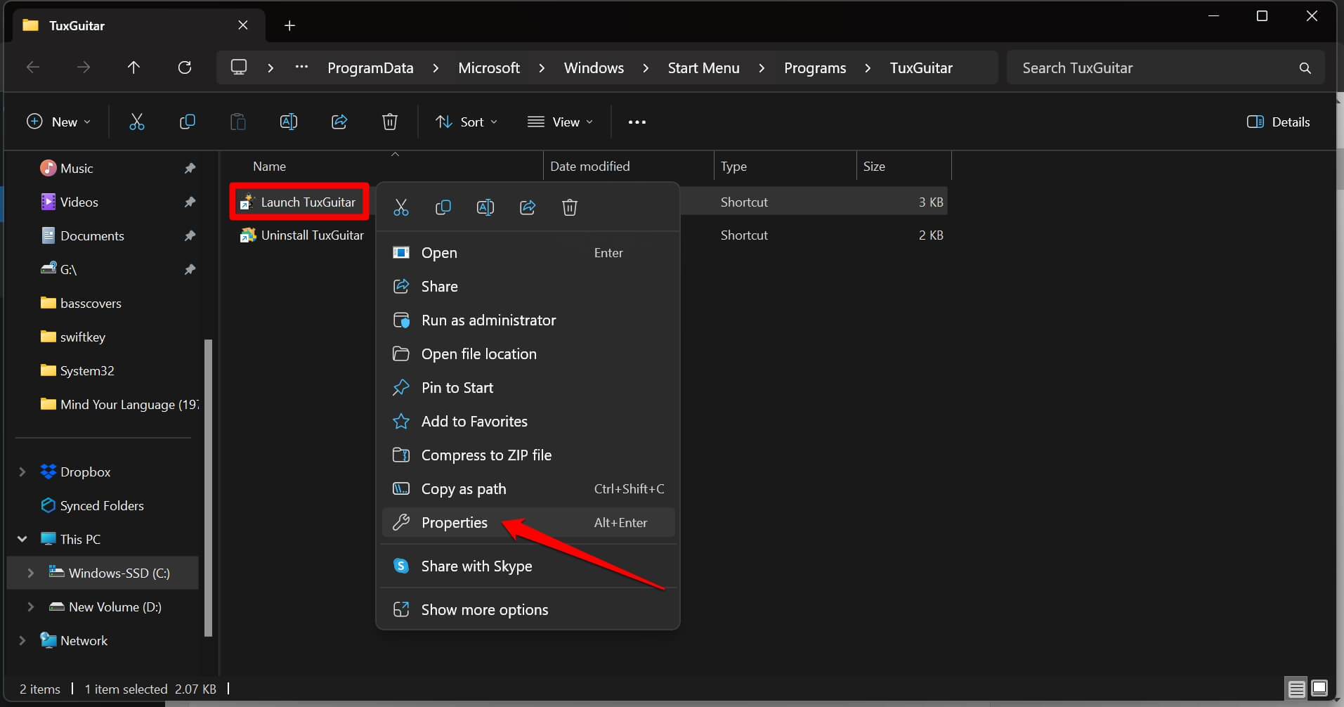 - 滚动到可执行文件,右键单击它,然后选择“属性”。