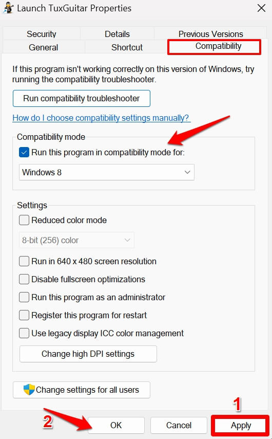 - 单击“在兼容模式下运行此程序”旁边的复选框。