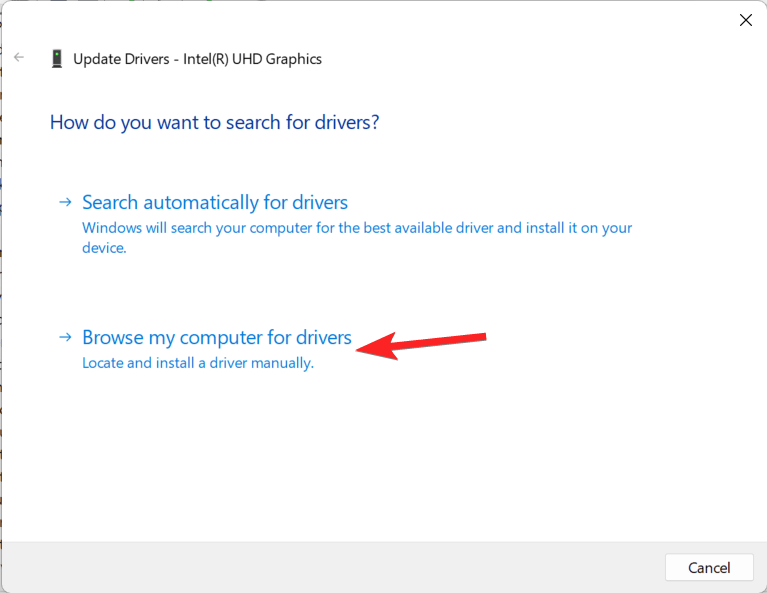 - 将出现“更新驱动程序”对话框。选择“浏览我的计算机以查找驱动程序”。