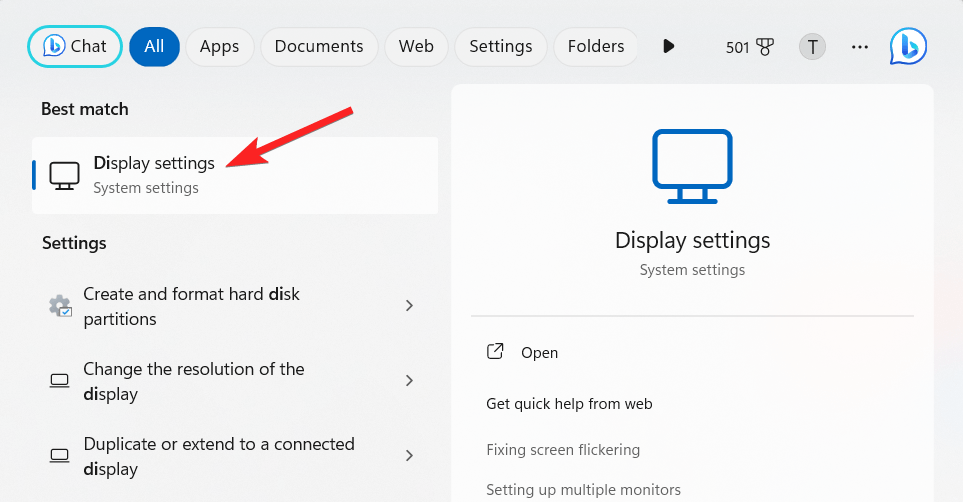 - 按 Windows 键,在搜索字段中键入“显示”,然后从选项列表中选择“显示设置”。