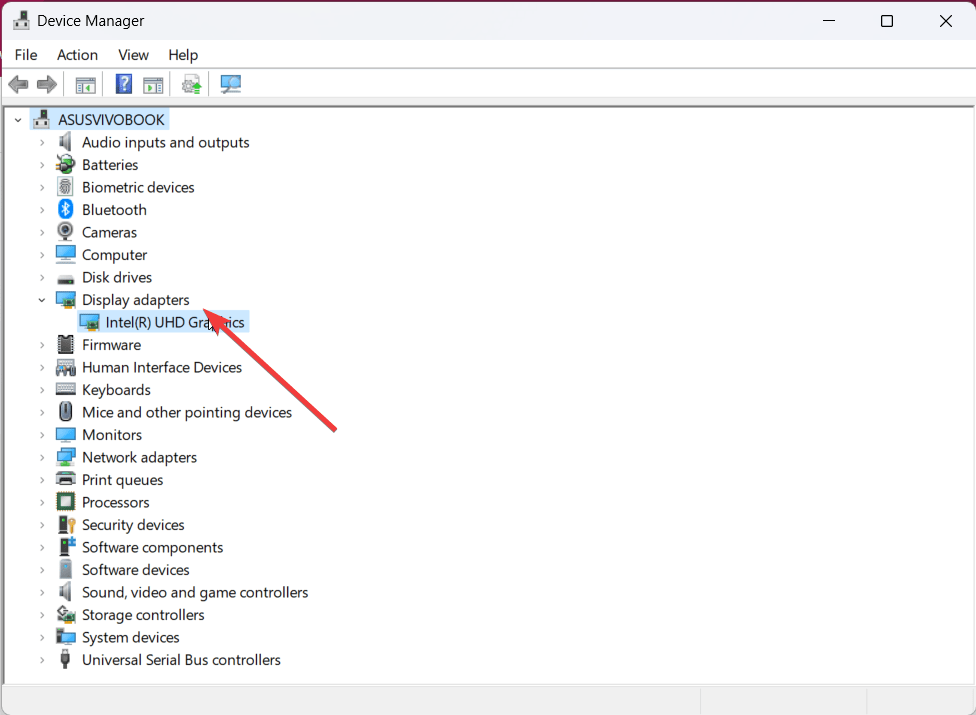 - 导航到“设备管理器”窗口,然后单击“显示适配器”部分以查看可用图形驱动程序的列表。