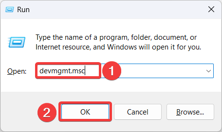 - 在“运行命令”窗口的搜索字段中输入 devmgmt.msc,然后单击“确定”。