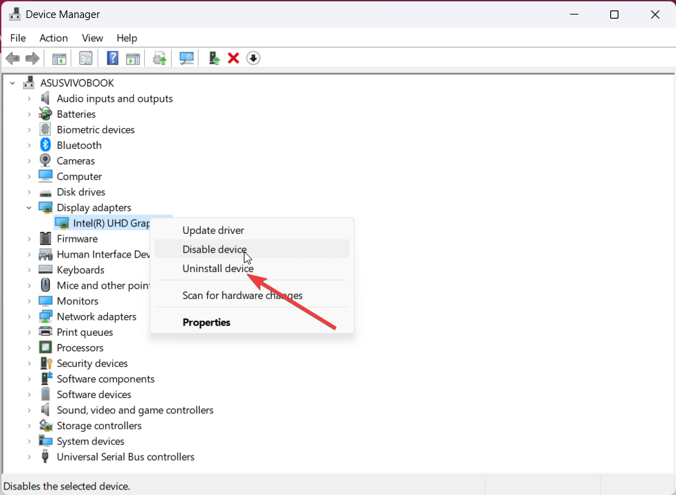 - 现在展开“显示适配器”部分,然后右键单击图形驱动程序以显示上下文菜单。从那里,选择卸载设备。