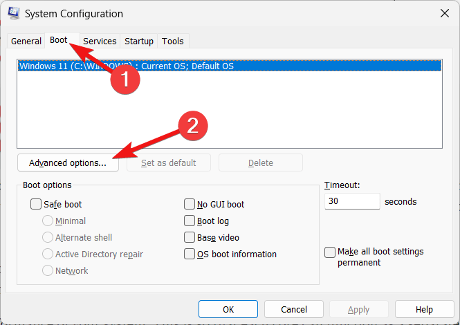 - 切换到“系统配置”窗口的“启动”选项卡,然后按位于其中的“高级选项”按钮以打开一个新窗口。