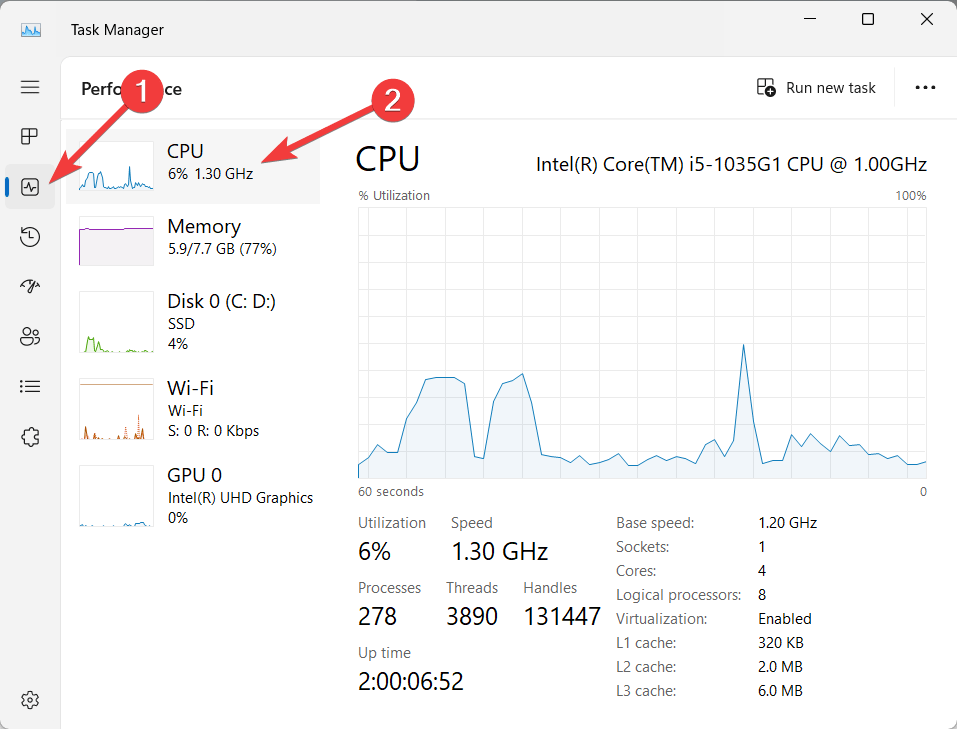 - 从左侧菜单切换到“性能”选项卡,然后从窗口的左侧菜单中选择“CPU”。您还会注意到逻辑处理器,即系统当前拥有的处理器总数(包括超线程)。