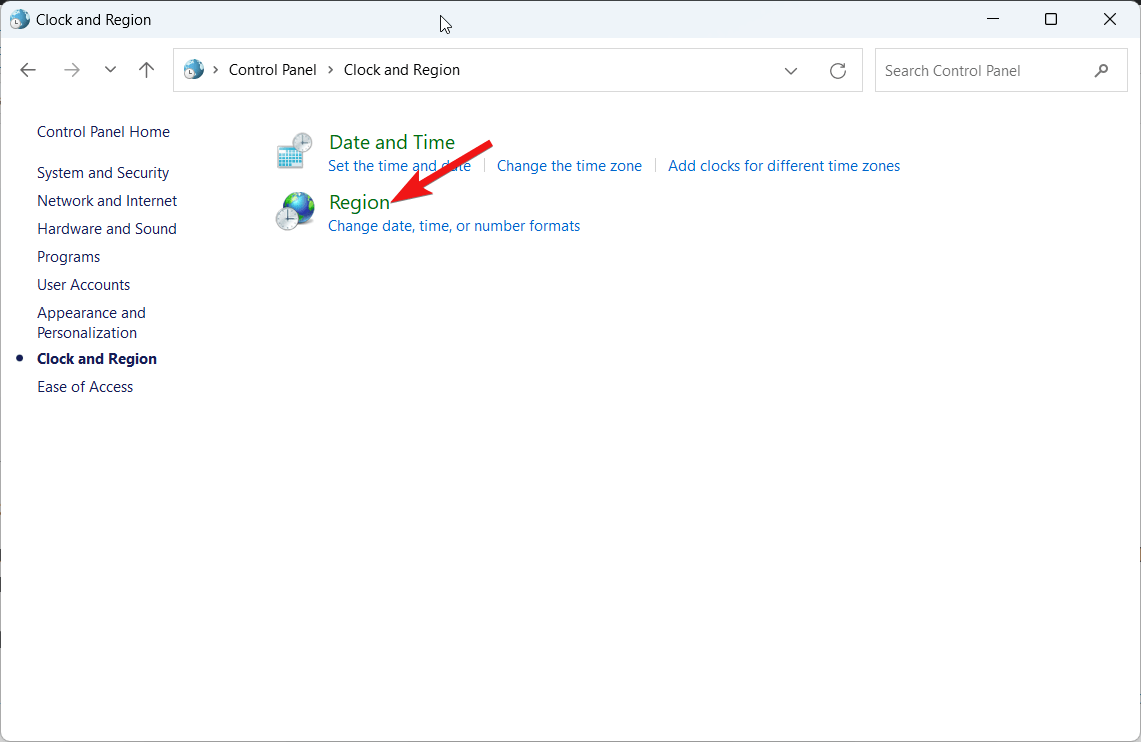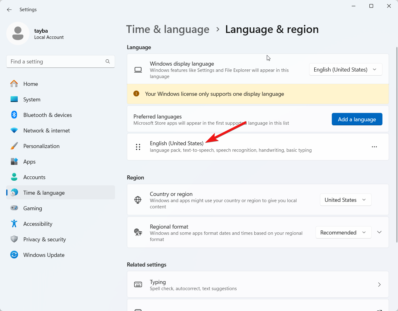 - 从左侧导航栏中选择“时间和语言”,然后从右侧部分选择“语言和区域”。
