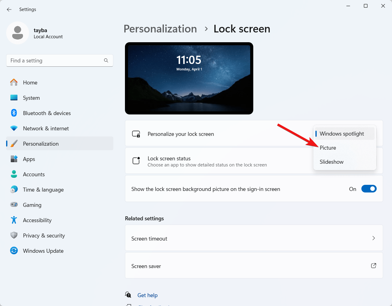 - 从“个性化锁屏界面选择菜单中选择”图片“,然后为锁屏选择相关图片。