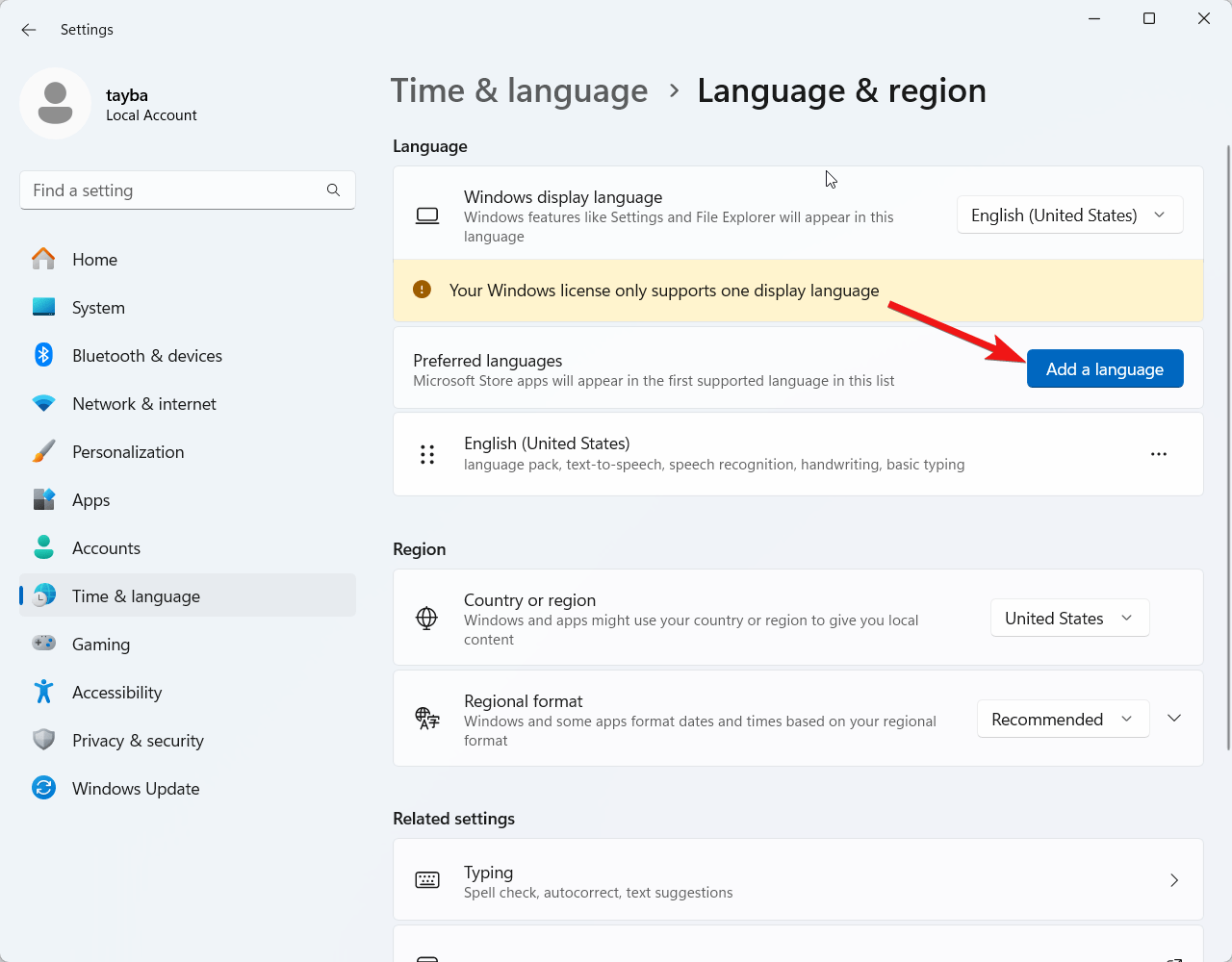 - 单击“添加语言”以重新安装英语(或首选语言)。