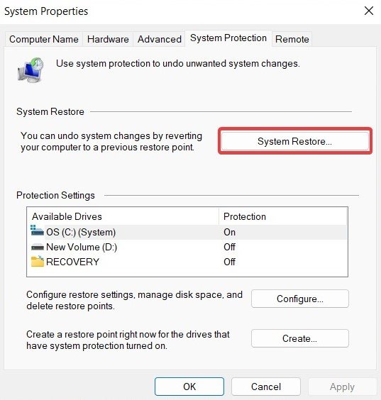- 切换到“系统保护”选项卡,然后按“系统还原”按钮。