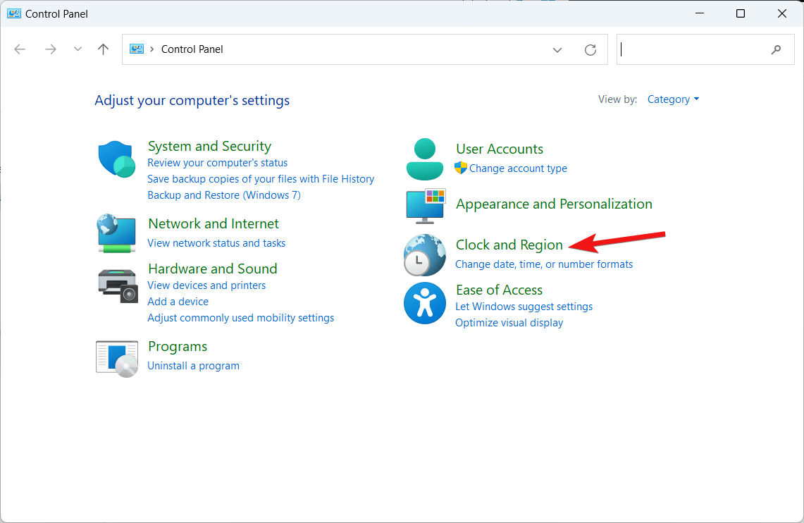 - 在“查看方式”下拉列表中选择“类别”,然后选择“时钟和区域”。