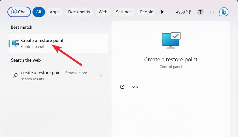- 按 Windows 键,在搜索栏中键入“创建还原点”,然后选择相关搜索结果以访问“系统属性”页。